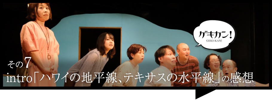 intro『ハワイの地平線、テキサスの水平線』。祖母が亡くなり、里子(のしろゆうこ/intro)は夫(小林テルヲ)と娘(中野葉月/清水企画)と祖母宅にいる。葬儀屋の根元(井上嵩之/→GyozaNoKai→)は葬儀プランを決めさせようとするが、そのたびに話は脱線、なかなか決まらない。